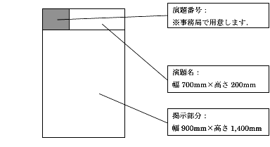 | 発表形式 | ●口演形式 原則としてご自身のパソコンによる発表とします.動画を含まない場合のみ,CD-RまたはUSBメモリによる持ち込みを可とします.VTRはご使用いただけません. ●示説形式 指定のパネル(下図参照)に掲示して頂きます.掲示および撤収は発表者ご自身でお願いいたします.掲示に必要な画鋲は事務局で用意します. |